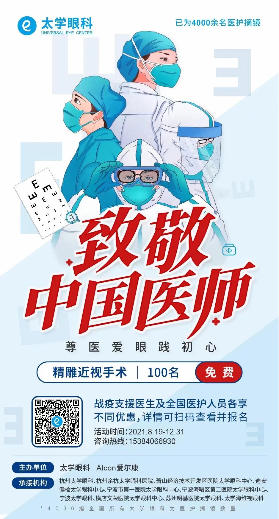 1. 100个免费近视手术名额,为援鄂、援冀、援外等战疫支援医生免费手术摘镜;